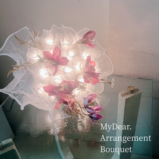 <フラワーライトLEDブーケ> 光る花のブーケにアーティフィシャルの造花を加え、リボンでとめたデザインの豪華なブーケです。 そのままフラワーベースにさしてご利用いただけます。 このままギフトとして大切な人へお贈りしても素敵です。 光の柔らかさと癒し空間を追求するために、花びらは繊細なシフォン素材を使用しています。 ひとつひとつ職人が手作りをしているので、サイズに若干の誤差がございます。 やさしくオレンジ色に光る電球は、コンセント式でスイッチひとつで簡単に点灯します。 ライトを付けて、やわらかく光る明かりに癒されたり、アートフラワーとしてお部屋に飾るのもおしゃれです。 花びら部分がワイヤーとシフォン素材でできています。 とても柔らかく、一枚一枚お好みに曲げられるのでお花の印象を変えられます。 茎もワイヤーにテープが巻かれた状態なので、曲げることで飾り方を変えてお楽しみいただけます。 「MyDear」では「大切な人へ」「私のお気に入りの」という意味です。 全ての商品に、メッセージが書き込めるオリジナルのタグを付けております。 贈りたい方の名前(アルファベット8文字まで)をお伝えいただければ、タグへ名前のスタンプをサービスでお入れいたします。 ロゴ入りショッピングバッグも同梱して配送しており、様々なシーンでの大切な方へのギフトに最適です。 サイズ/重さ <本体サイズ> 高さ 約28~32cm 横 約23〜26cm(上部・お花部分) 最下部 約10cm(茎の最下部) <本体の重さ> 約300g前後 ※サイズは種類・個体によって差があります ※サイズやタグの説明画像は商品の色が違うものを使用しております、数字や内容のみご確認ください。 ご使用方法 ・コイン電池を2個使用します。(最初はテスト電池が入っています) ・室内専用商品です。雨や水にぬれない場所でご使用下さい。 注意事項 ・こちらはブーケ単体で、花瓶は付属していません。 花瓶を購入ご希望の方は、別途ご購入下さい。 ・本商品に使用しているフラワーは「造花」です。 ・1点1点手作りの為、商品によってはサイズなどに多少の個体差や表情の違いがありますが、商品の特性であり、不良ではございません事あらかじめご了承ください。 茎の部分はワイヤーと電線をフラワーテープでコーティングしており、自由に曲げられますが、あまり強く曲げると中の電線が切れてしまったり、中のワイヤーが見えてしまう場合がございます。 テープの色が薄くなっている箇所があっても構造上の問題ではございませんので予めご了承ください。 ・ライトや直射日光に長時間当たると花びらの色が変色することがあります。なるべく直射日光や照明が強く当たらない場所に置いてご使用いただくことをお勧めしております。 ・箱から取り出す際には花びらが傷つかない様にゆっくりと、お出しください。 ・仕入れの都合により、組み合わせるアーティフィシャルフラワーのデザインが若干変更することがございます。 ・シフォン素材はデリケートなので、繊維の伝染にお気をつけください。 ・お使いのモニターにより商品の色や質感が異なって見える場合がございます。予めご了承ください。 ・海外生産品につき保証書などはございません。 ・白熱球商品と違い、LED商品は電球の交換ができません。 ・ご使用前に必ず付属の取り扱い説明書をよく読み、正しくご使用ください。 何かご不明点等ございましたら、お気軽にお尋ねくださいませ。