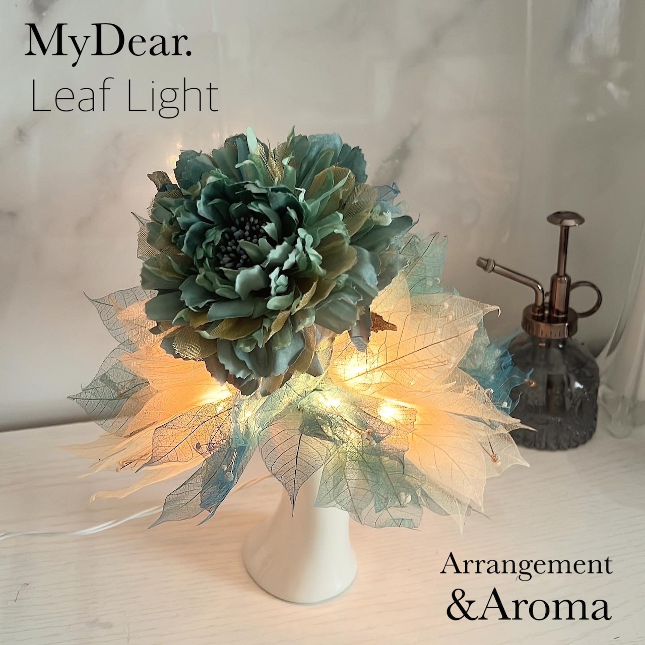 本物の葉の葉脈のみを残した透け感のある葉で電飾を囲み、ブーケ型にまとめた商品です。